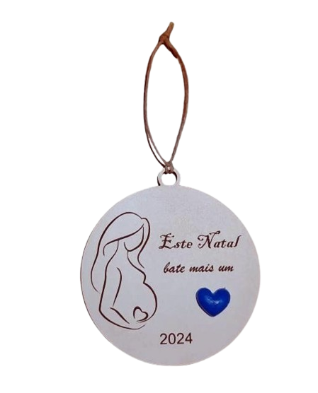 Esta peça é uma bola de Natal, cortada em MDF de 3mm, trazendo elegância e personalização para as festividades. O design inclui a delicada figura de uma grávida, simbolizando a expectativa de uma nova vida, com a frase "Este Natal bate mais um" gravada, tornando-a uma lembrança especial para famílias à espera de um bebé. No centro, um coração em gesso pintado à mão na cor escolhida pelo cliente adiciona um toque único e artístico à peça. Ideal para decorar a árvore de Natal, esta peça personalizada é feita com precisão e qualidade, garantindo durabilidade e beleza.