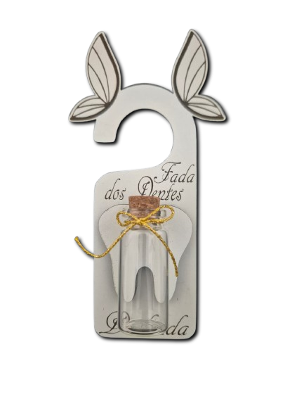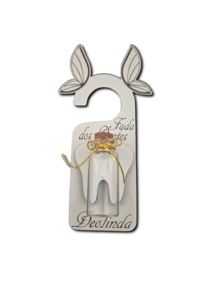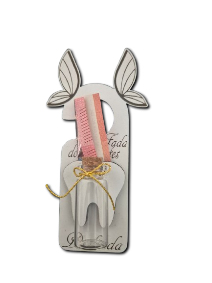 Com este suporte encantador, a criança pode colocar o dente de leite no frasquinho incluído, deixando espaço para que a fada traga durante a noite uma moeda ou até uma nota como recompensa.