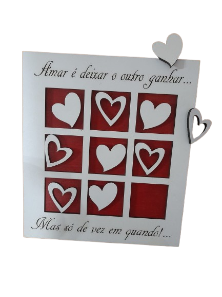 Este é um Jogo do Galo em MDF Branco, com um design romântico e elegante. O tabuleiro é composto por corações em vez dos tradicionais "X" e "O", tornando-o perfeito para momentos a dois. O destaque está na personalização do texto, permitindo que você adicione uma mensagem especial, tornando-o um presente único e exclusivo. As peças do jogo, também em formato de coração, são destacáveis e pode ainda escolher cor de fundo!